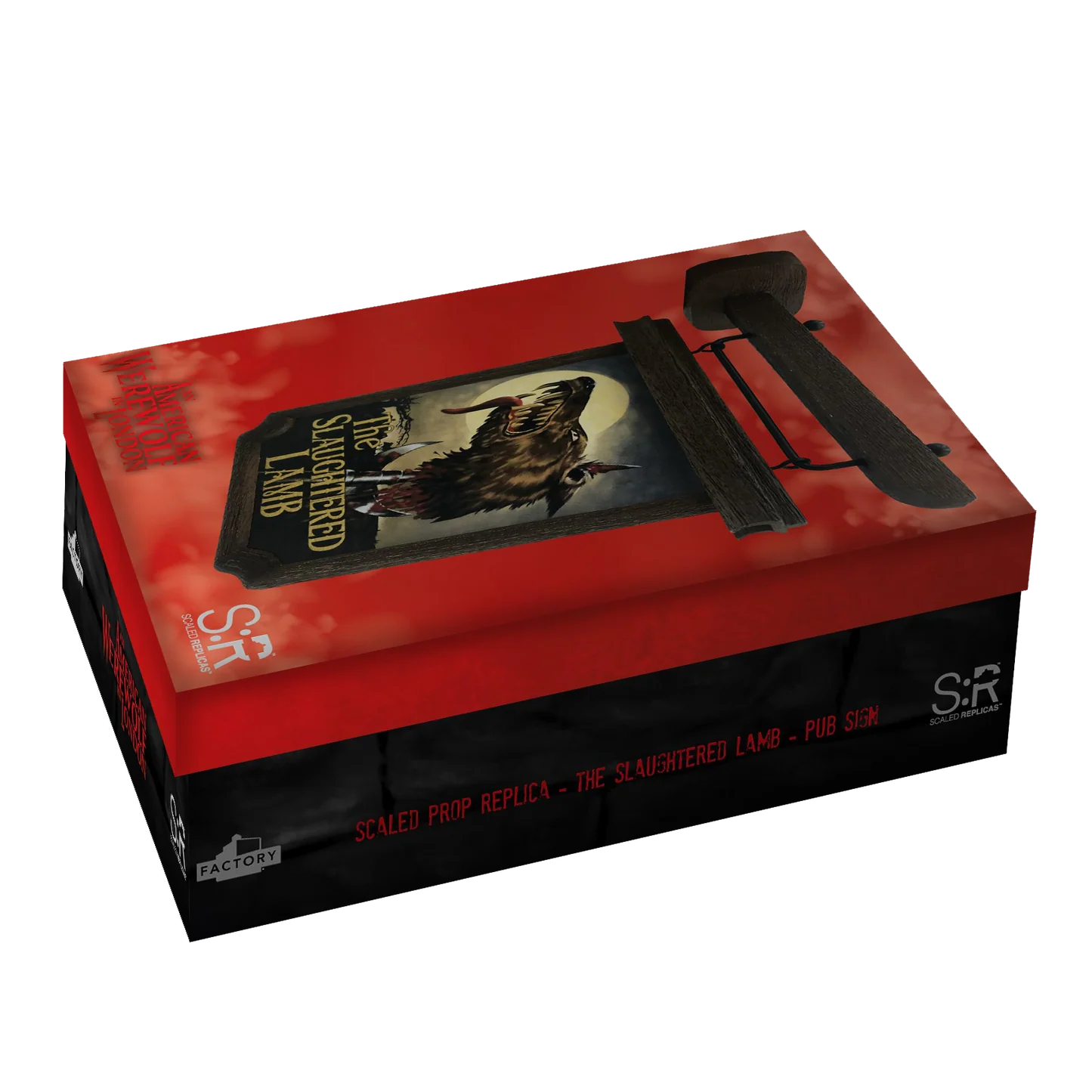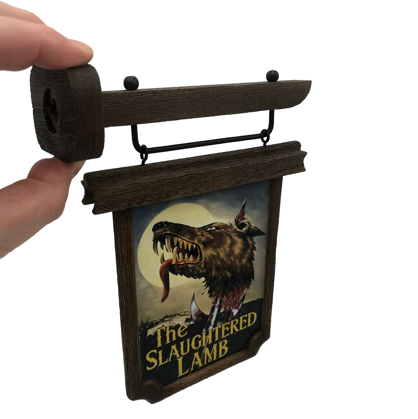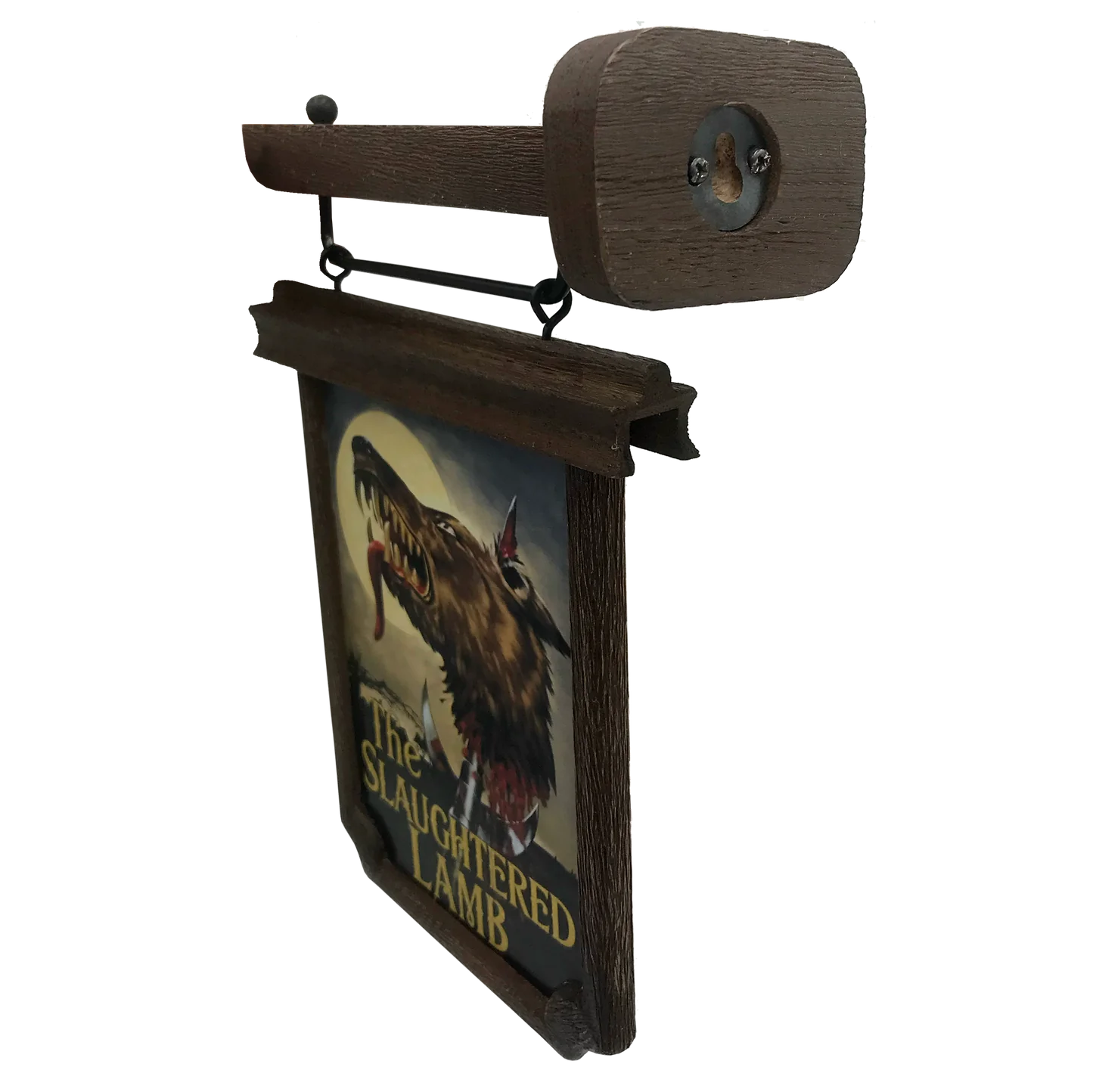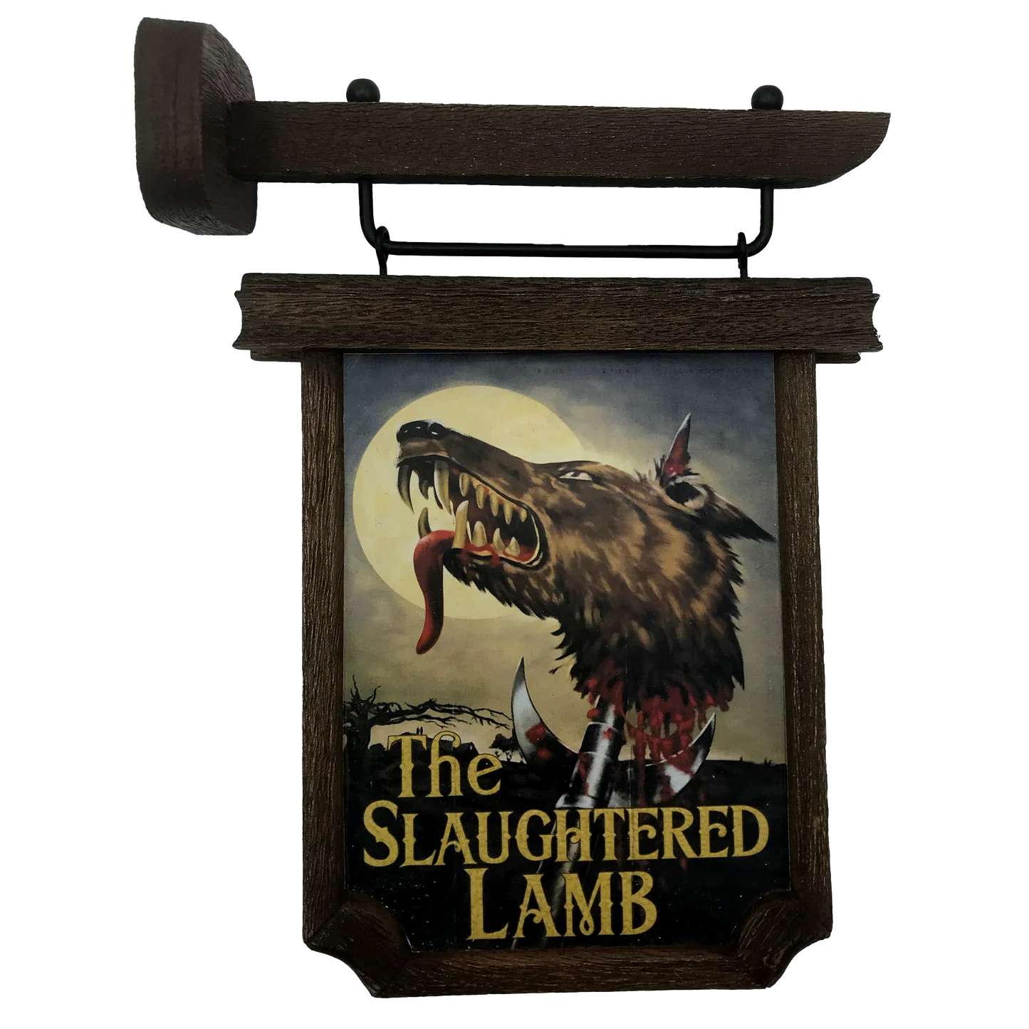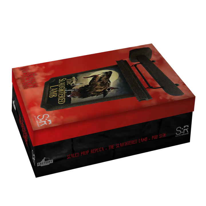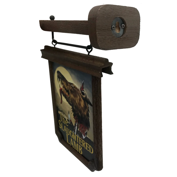 A high quality, officially licensed scaled prop replica of the iconic Slaughtered Lamb pub sign seen in the film An American Werewolf in London. Located on the remote Yorkshire Moors, The Slaughtered Lamb pub is where American backpackers David Kessler and Jack Goodman are warned by the local pub-goers “Stay on the road, keep clear of the moors"