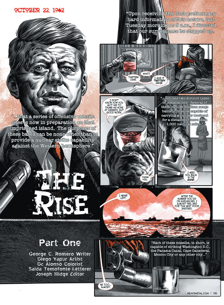 George C. Romero’s THE RISE – a prequel to the film “Night of the Living Dead” – serialization starts in this issue as well as Michelle & Bart Sears haunting tale of revenge, MAIDEN! We look at our distant past and follow Liberatore’s LUCY in an era where the ascension of the hominids had just begun. In Brendan Columbus´ SAVAGE CIRCUS Deputy Brady Harrison must navigate through a city of deranged animals, psychotic criminals, and crazed ringleader Lewis Savage to protect his citizens and save his town. Balcarce and Jok show us what happens when God dies. In the distant future, Medney’s Benedict Gunn guides the DARK WING crew in search for a new world to call home.