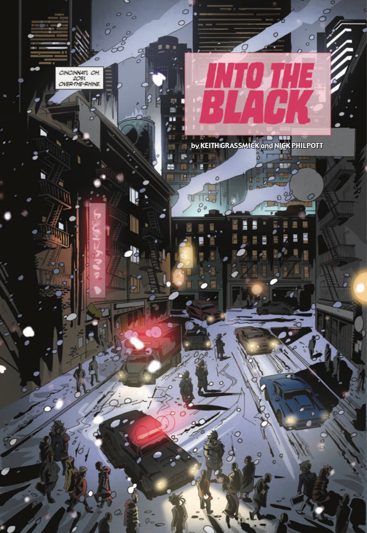 “Into The Black” is a Bladerunner style graphic novelette by newcomers Keith Grassmick and Nick Philpott with colors by Dennis Calero.