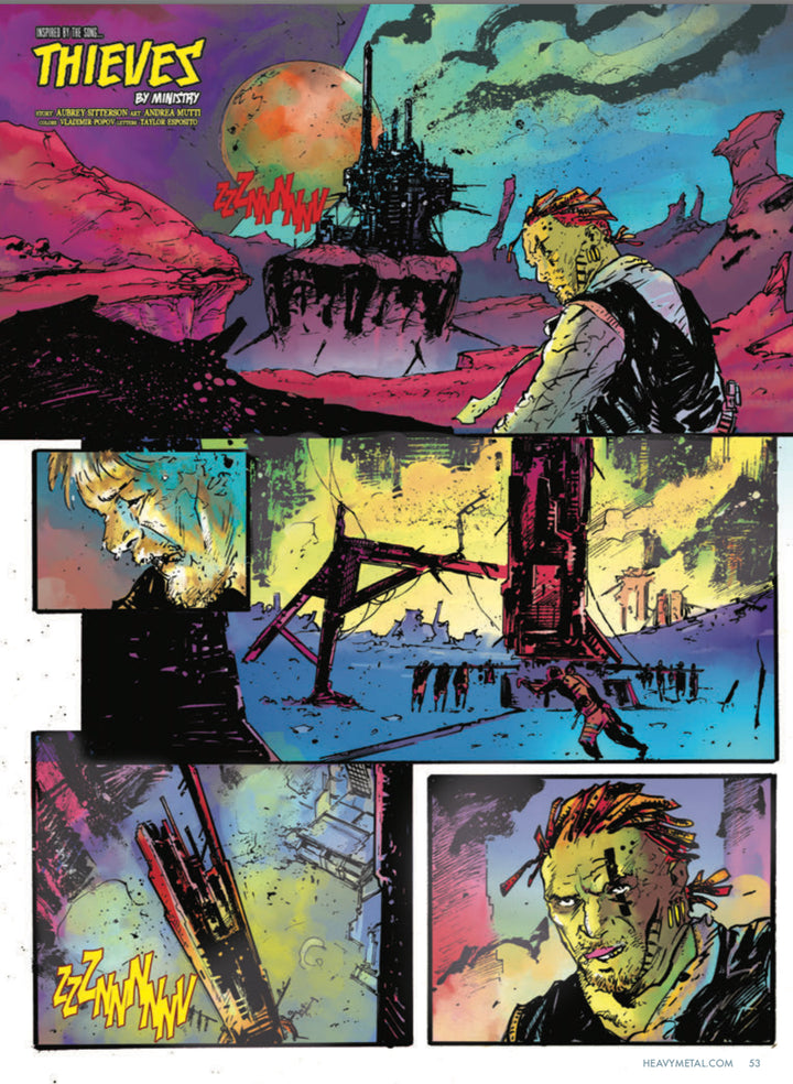 Industrial band, MINISTRY, makes their debut in Heavy Metal with an adaptation of their song “Theives” by Aubrey Sitterson with art by Andrea Mutti.