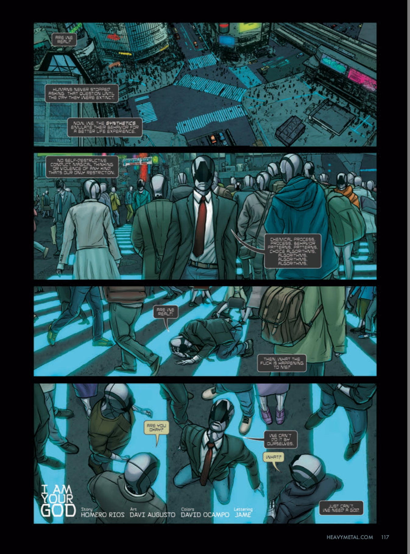“1NF3RN0” by Curt Pires & Thom London with art by Antonio Fuso shows a future where religion is dictated by giant machines, who make mistakes more often than they like to admit.