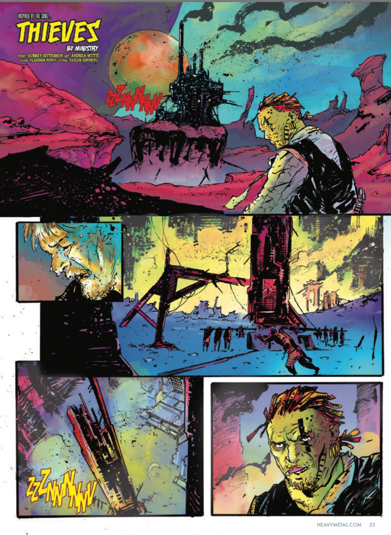 Industrial band, MINISTRY, makes their debut in Heavy Metal with an adaptation of their song “Theives” by Aubrey Sitterson with art by Andrea Mutti.