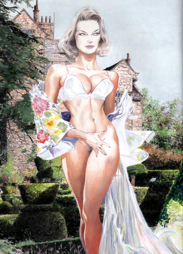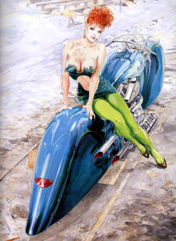 Sexy and suggestive, full of passion and light, Sire_s female forms veer between heavy breasted seductresses and glorious angels of light. Beautifully stylized renditions of European motorcycles, cars and WWII vintage air planes add additional manly interest to this hardcover retrospective volume. Sire eschews the use of India ink in favor of adding color directly without black outlines. The result produces uncommonly atmospheric and luminous eye candy that is pleasurable to gaze at for hours.