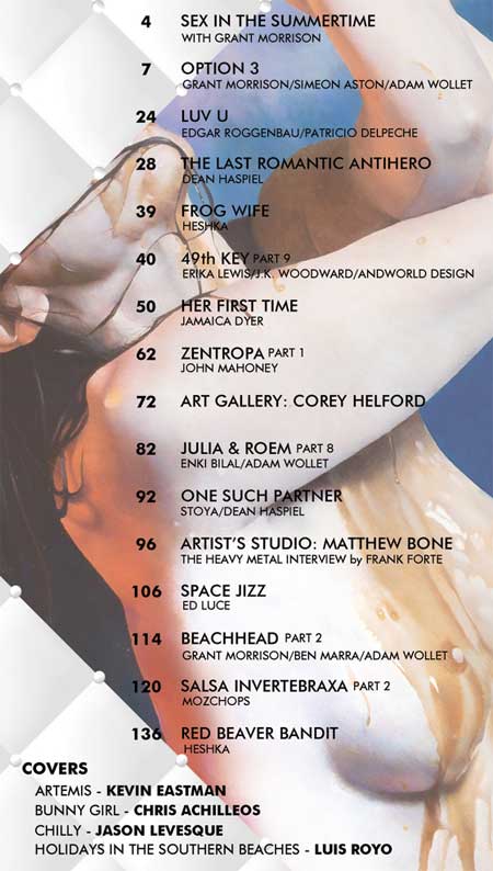 Grant Morrison continues his run as Heavy Metal's new Editor-In-Chief with his ongoing story BEACHHEAD, and his new story for issue #281. HM's publisher, Kevin Eastman presents his first HM Cover! Also continuing are Eniki Bilal, Erika Lewis, and J.K. Woodward's The 49th Key, Mozchops' irreverent insect opus, Salsa Invertebraxa, and much more!